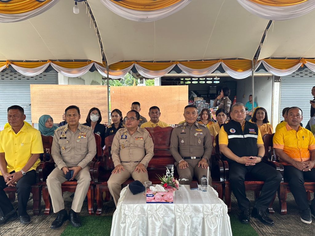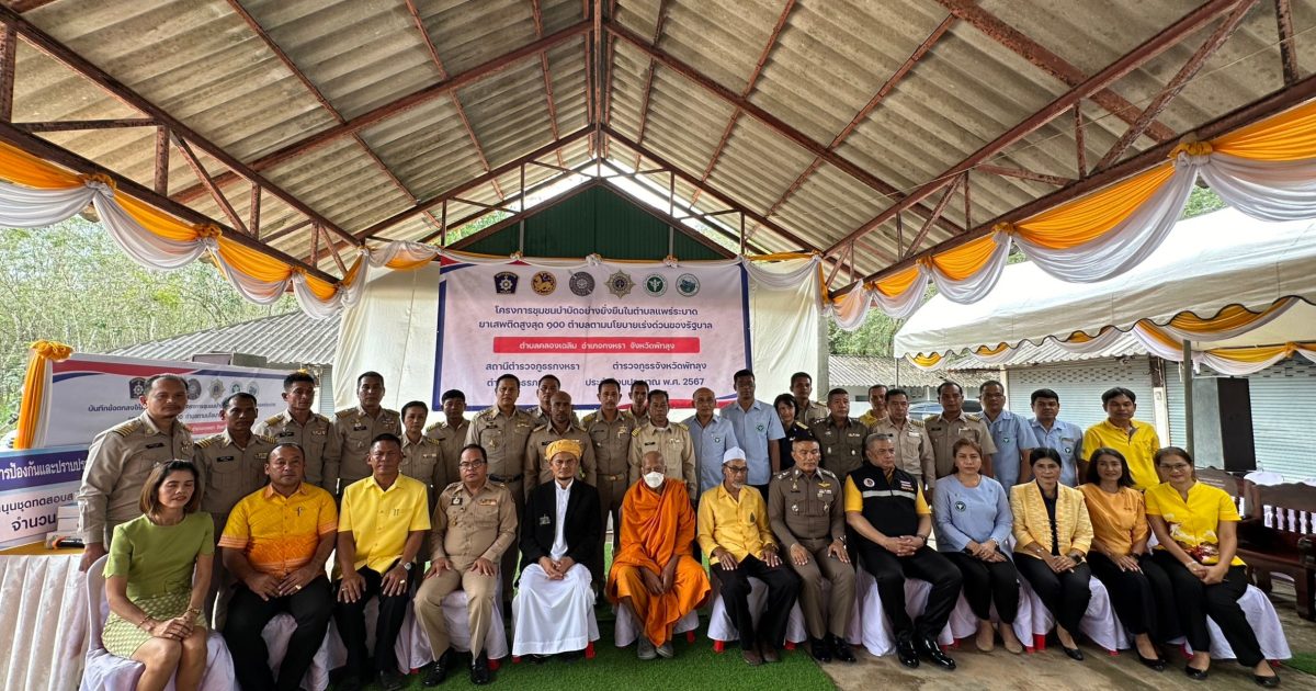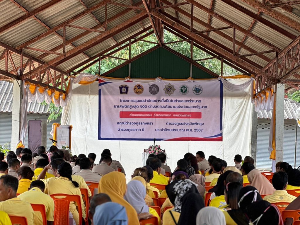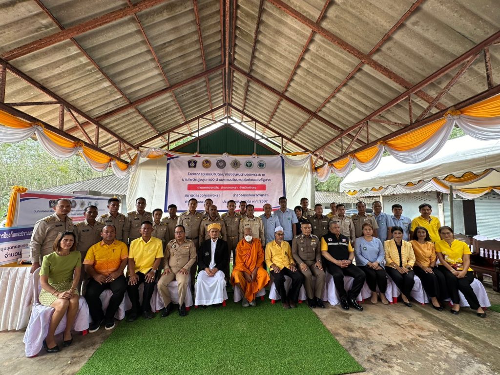 เมื่อ 20 ธ.ค. 66 เวลา 13.30 น. นำโดย นายก้องสกุล จันทราช รองผู้ว่าราชการจังหวัดพัทลุงประธานในพิธีเปิดโครงการชุมชนบำบัดอย่างยั่งยืนในตำบลแพร่ระบาดยาเสพติดสูงสุด 100 ตำบล ตามนโยบายเร่งด่วนของรัฐบาล ต.คลองเฉลิม อ.กงหรา จว.พัทลุง พร้อมด้วย พล.ต.ต.ณฐกรญ์ กาญจนาภรณ์ ผบก.ภ.จว.พัทลุง นายกองเอกอดุลย์ ชูทอง ปลัดจังหวัดพัทลุง พ.ต.อ.สุริยา ปัญญามัง รอง ผบก.ภ.จว.พัทลุง นายสมควร ปล้องอ่อน นายอำเภอกงหรา พ.ต.อ.ปิยะวัฒน์ ขวัญศรีผกก.สภ.กงหรา นางสายชล จันทร์หนู นักวิเคราะห์นโยบายและแผนชำนาญการพิเศษ/ผู้แทน สำนักงานป้องกันและปราบปรามยาเสพติด ภาค 9 นายอำพล แก้วเกื้อ รองนายแพทย์สาธารณสุขจังหวัดพัทลุง นายศักดิ์สุริยา เสนาทิพย์ นายก อบต.คลองเฉลิม และเจ้าหน้าที่คณะทำงานโครงการชุมชนบำบัดอย่างยั่งยืนฯ เจ้าหน้าที่ตำรวจ สภ.กงหรา, หัวหน้าส่วนราชการที่เกี่ยวข้องพร้อมข้าราชการ พนักงาน ,ผู้ใหญ่บ้านและผู้ช่วยผู้ใหญ่บ้านตำบลเลาขวัญ , ประธานคุ้มและคณะกรรมการคุ้มพร้อมด้วยสมาชิกคุ้ม ร่วมพิธีเปิดโครงการชุมชนบำบัดอย่างยั่งยืนฯ ณ ศูนย์ อปพร. ต.คลองเฉลิม อ.กงหรา จว.พัทลุง