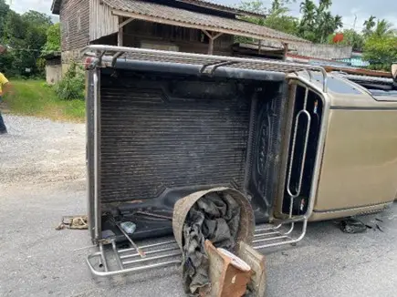 รถจักรยานยนต์คันยี่ห้อ ฮอนด้า รุ่นเวฟ สีน้ำเงิน-ดำ หมายเลขทะเบียน 1กข 6374 พัทลุง ซึ่งมีนายทรงศักดิ์ ชายเกตุ อายุ 53 ปี ที่อยู่ 353 ม.9 ต.คลองเฉลิม อ.กงหรา จ.พัทลุง ล้มอยู่บริเวณลานวัดโล้ะจังกระ ได้รับความเสียหาย